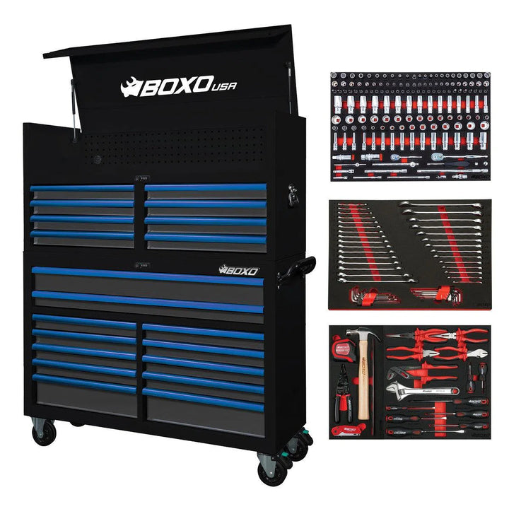 Introducing the ultimate tool storage solution from BoxoUSA: the BoxoUSA 53" Pro Series Loaded Tool Box Combo. This comprehensive set includes our 53" 12-drawer bottom tool cabinet, 53" 8-drawer top tool chest, and the BXE005C-R2, 222-Piece Master Tool Set, offering a total of 20 drawers in a loaded top and bottom tool box combo.